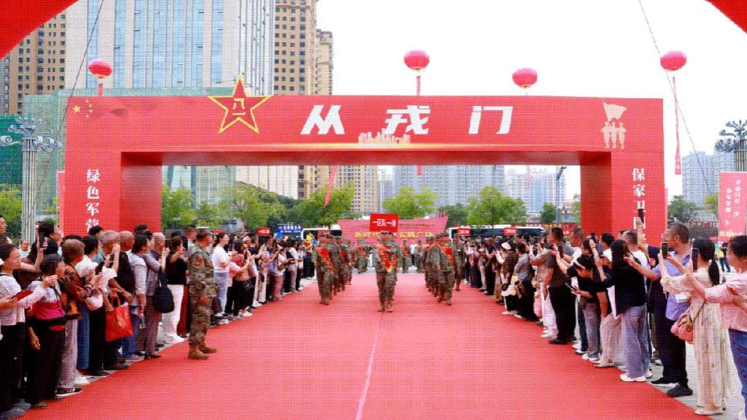 在欢快的锣鼓声中,全体新兵迈着整齐的步伐,依次昂首跨过“从戎门”,象征着正式告别家乡,踏上保家卫国的新征程。“从戎门”后的签名墙上,“热血男儿 精忠报国”八个大字格外醒目。新兵们纷纷拿起笔,在墙上郑重签下自己的名字,一笔一划间写下对军旅生活的憧憬与守护家国的决心。