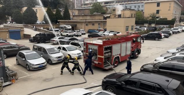 在实战环节中,学院祥瑞A公寓五层南侧模拟突发火情,消防员迅速使用消防设备将其扑灭,全体学生目睹了救火过程,切身感受了火灾的危害和消防员扑灭高楼火情的危险和不易。