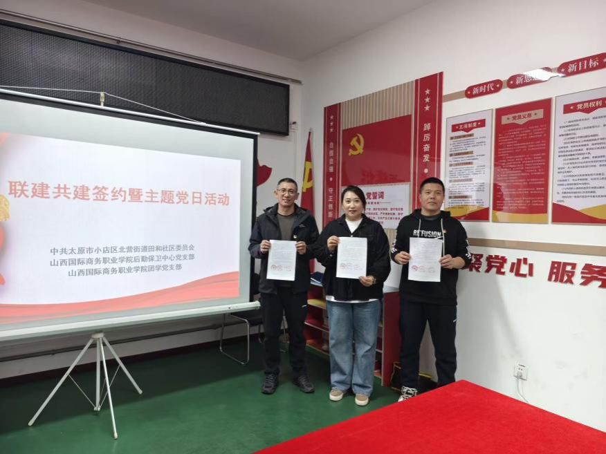 为深入贯彻落实新时代党的建设总要求,积极探索学院与地方党组织优势互补、资源共享、共同发展的党建新路径,推动形成区域化党建共同体,形成矛盾联调、风险联控、问题联治格局,服务山西地方经济社会高质量发展和学院教育教学内涵式发展,2025年11月4日,我院后勤保卫中心党支部、团学党支部一行赴中共太原市小店区北营街道田和社区委员会,开展联学联建暨主题党日活动,并正式签订校地党组织区域化联建共建协议,为深化校地协同、共促发展搭建起坚实桥梁。