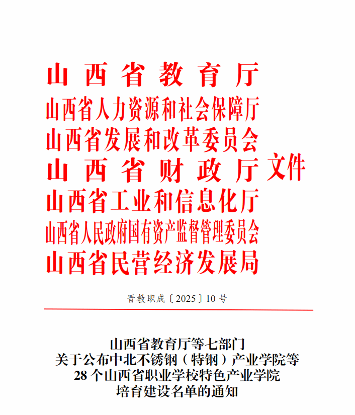 近日,山西省教育厅发布《山西省教育厅等七部门关于公布中北不锈钢(特钢)产业学院等28个山西省职业学校特色产业学院培育建设名单的通知》晋教职成〔2025〕10号,我院对接小店数字经济专业镇,携手龙头企业智林...